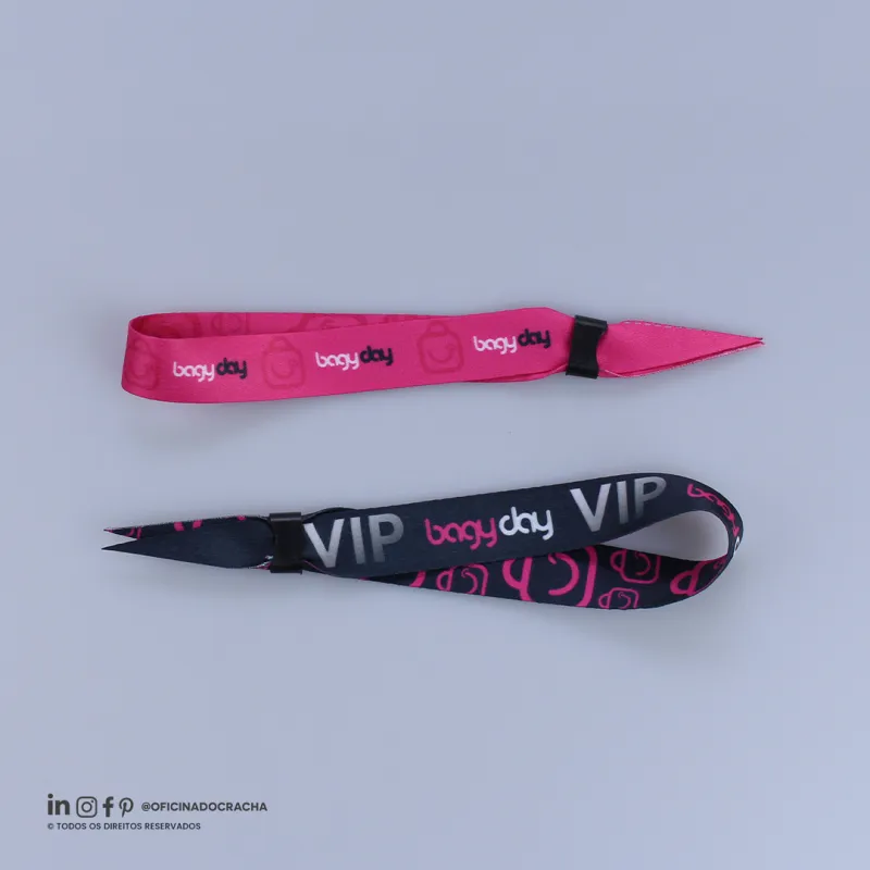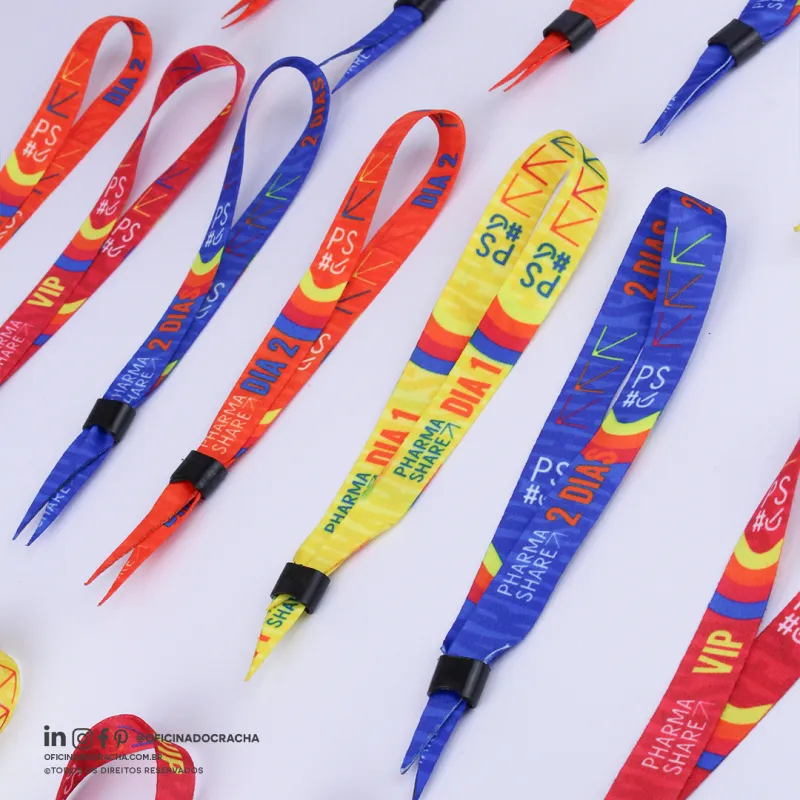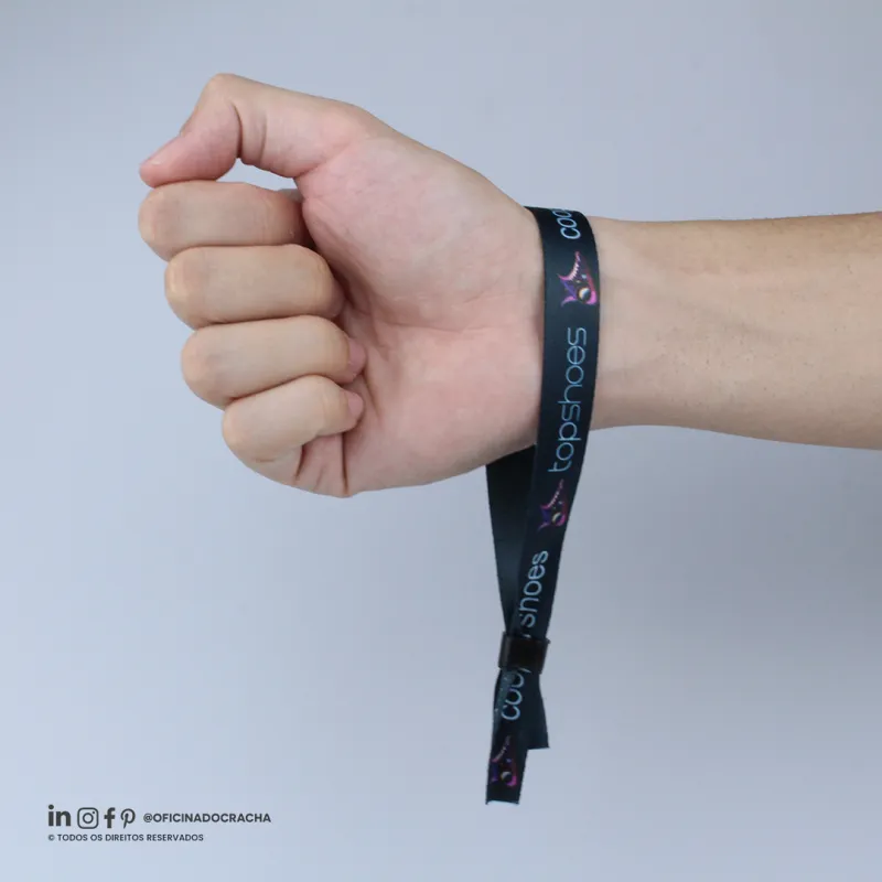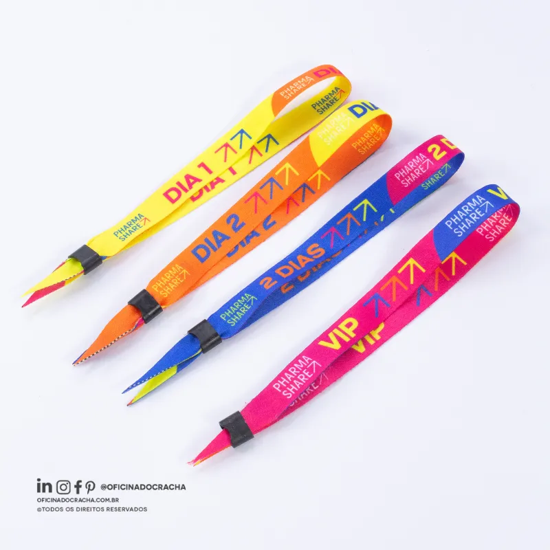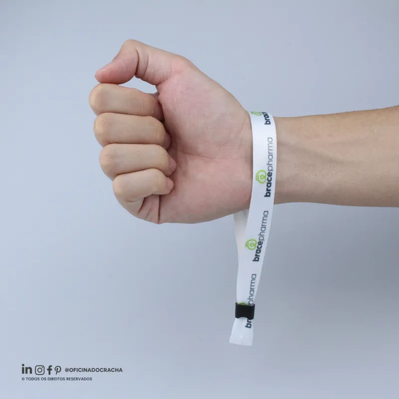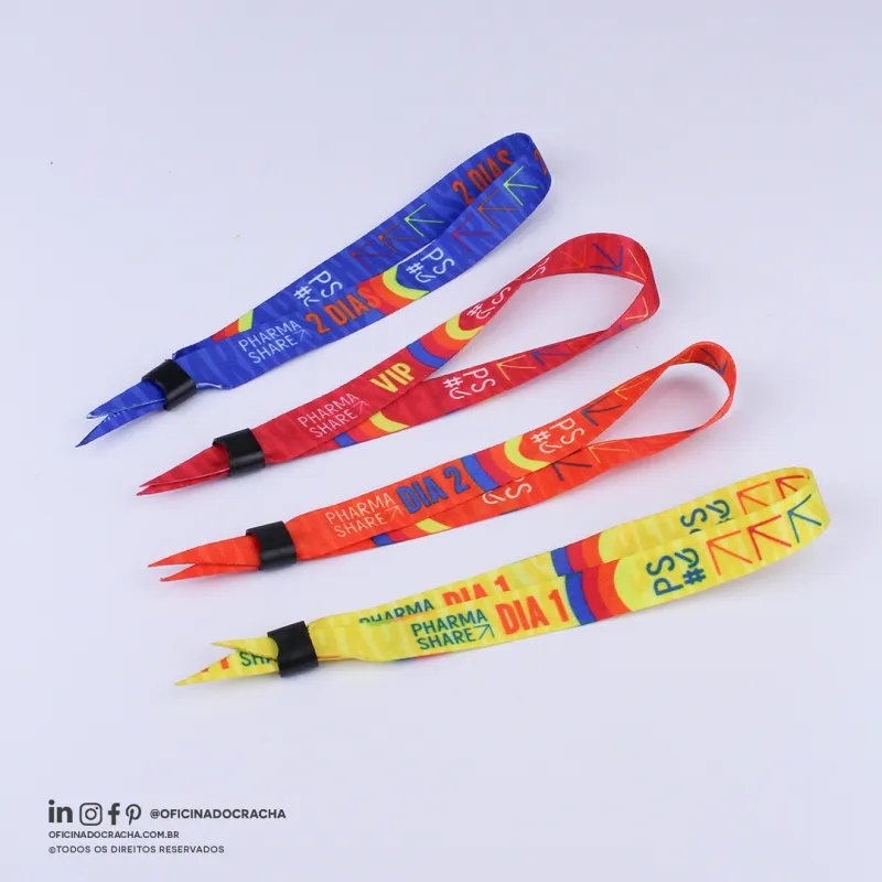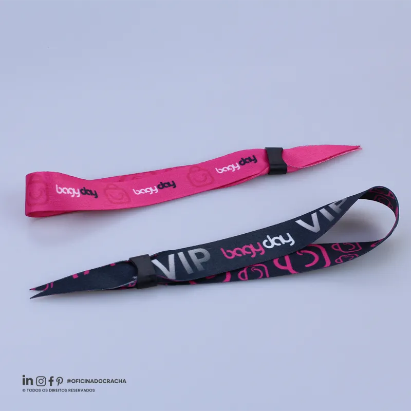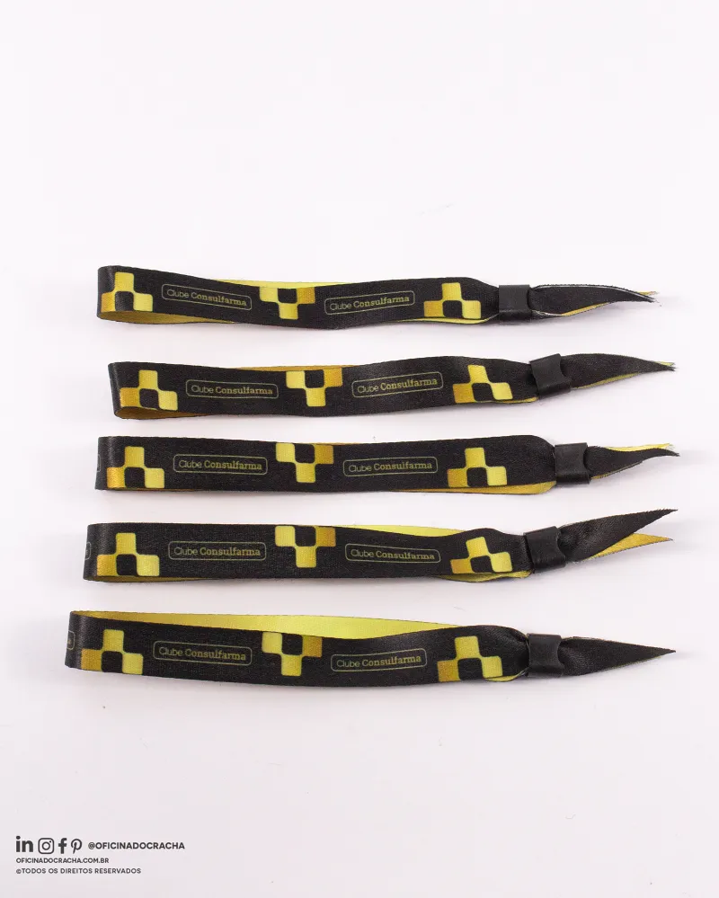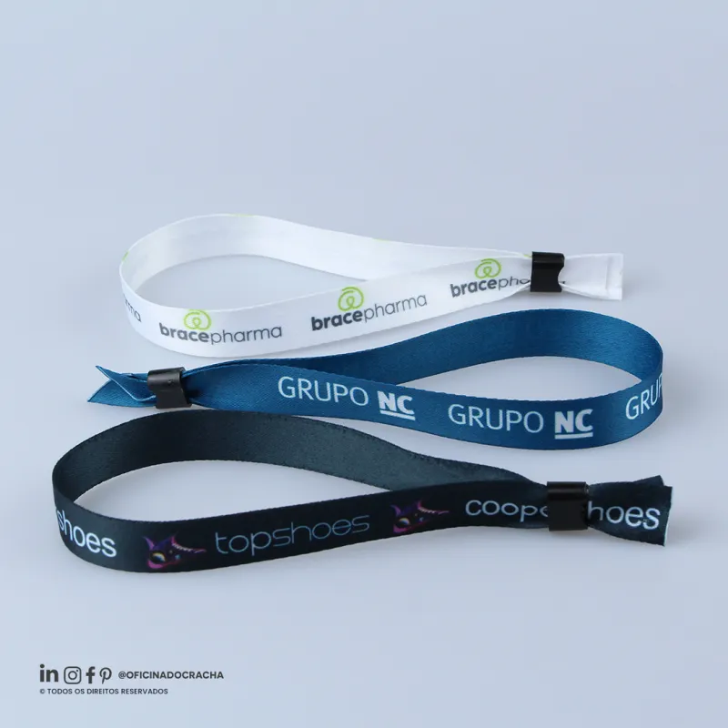 Fabricadas em fita 100% poliéster acetina, resistentes e confortáveis. Com lacre de segurança, garantindo mais segurança para seu evento. Ideais para controle de acesso em hotéis, parques, eventos e áreas VIP. Opções lisas ou personalizadas com impressão digital.